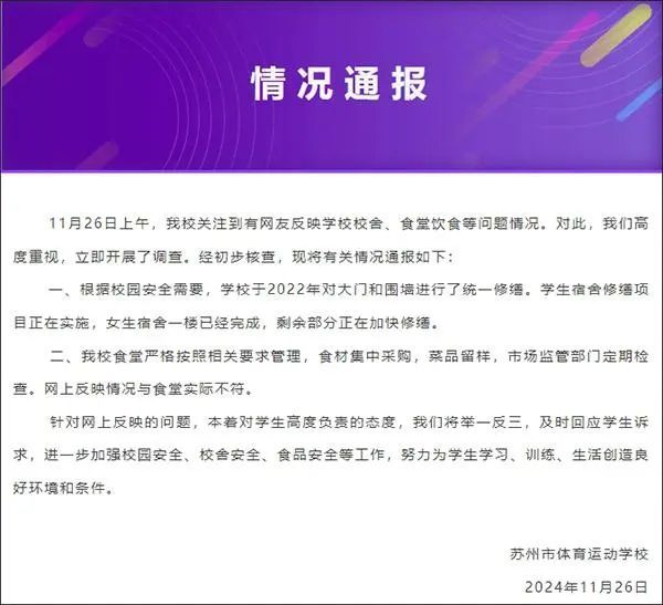 据苏州市振吴实验学校微信公众号“苏体振吴”音问开yun体育网,针对网友反馈的寝室墙面发霉、食堂鸡蛋发霉等情况,苏州市体育分解学校11月26日发布情况通报。